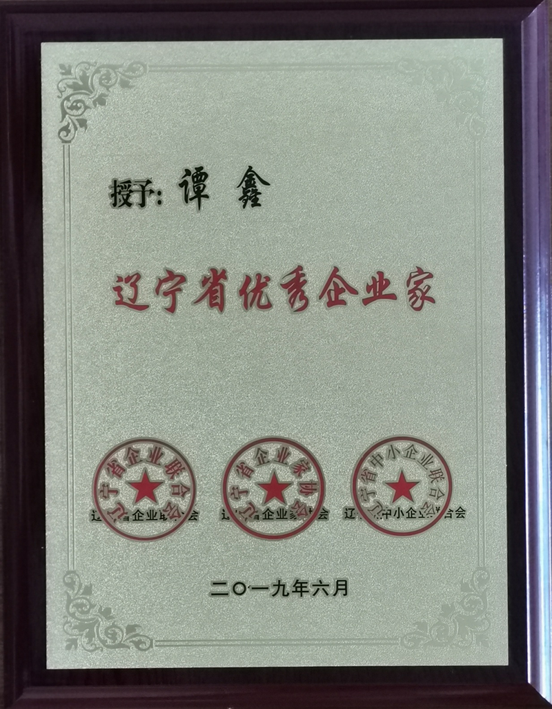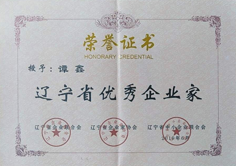 譚鑫總經(jīng)理2018年度遼寧省優(yōu)秀企業(yè)家榮譽證書