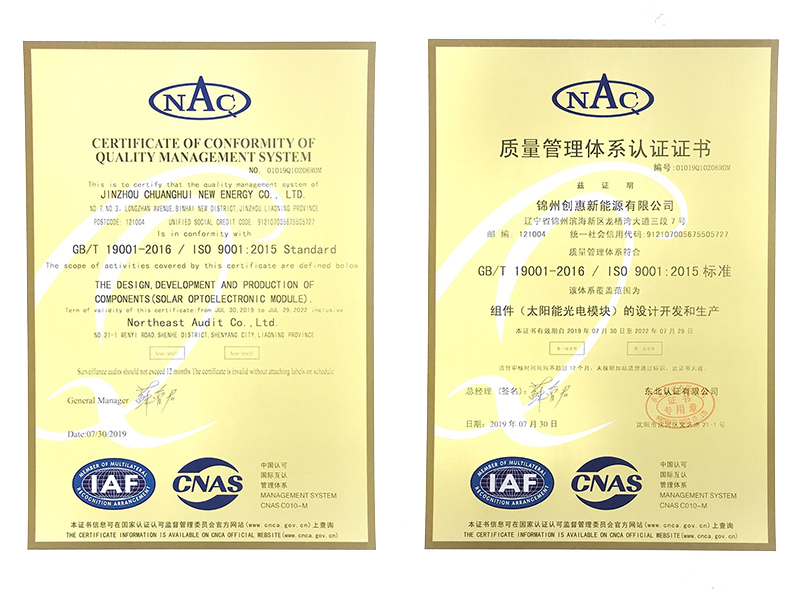 2019年7月30日,錦州陽光能源有限公司全資子公司錦州創(chuàng)惠新能源有限公司喜獲質(zhì)量體系認(rèn)證證書