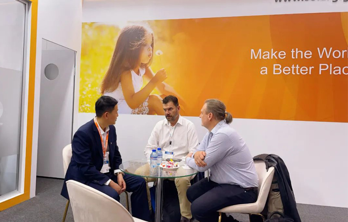 本屆德國展,陽光能源展出了我司的“明星產品”——GIGA系列組件,其卓越的性能和高效的轉換效率,深受客戶好評?,F(xiàn)場,陽光能源工作人員還與來自世界各地的業(yè)內人士展開了深度交流與業(yè)務洽談。