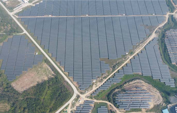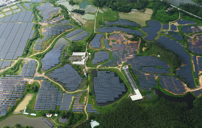 值得一提的是,廣東省開平市150MW光伏項(xiàng)目綜合采用了“農(nóng)光互補(bǔ)+漁光互補(bǔ)”新型發(fā)電模式——板上光伏發(fā)電,板下土地進(jìn)行農(nóng)業(yè)種植、板下水域進(jìn)行漁業(yè)養(yǎng)殖——滿足周邊用電需求的同時(shí),還實(shí)現(xiàn)了電力與農(nóng)業(yè)、漁業(yè)的有機(jī)結(jié)合,實(shí)現(xiàn)三重經(jīng)濟(jì)收益。從高空俯瞰,耕地、漁田與陽(yáng)光組件交相輝映,波瀾壯闊。
