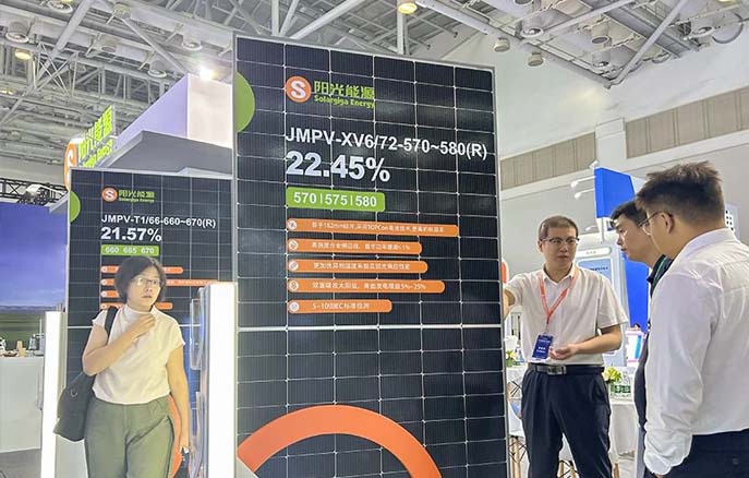 本屆展會,陽光能源重點展示了Giga-N系列兩款高效產(chǎn)品,分別是182 72版型雙玻和182 54版型單玻全黑組件,采用前沿的N型TOPCon技術(shù),具備高效率、高發(fā)電量、高品質(zhì)等多重優(yōu)勢,能夠為客戶帶來更高的價值。其中,182 54版型單玻全黑組件是陽光能源面向全球分布式市場打造的高端產(chǎn)品之一,外觀精美,量產(chǎn)效率可達21.76%,被廣泛應(yīng)用于建筑屋頂?shù)葢?yīng)用場景。