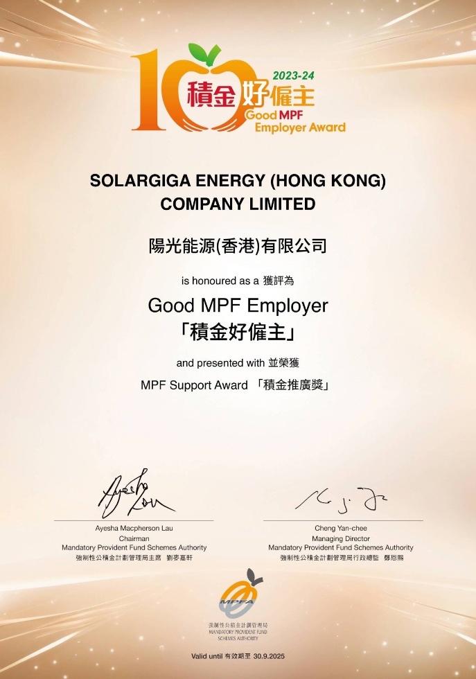 近日,陽(yáng)光能源控股有限公司(以下簡(jiǎn)稱“陽(yáng)光能源”)旗下陽(yáng)光能源(香港)有限公司憑借以人為本的理念和企業(yè)社會(huì)責(zé)任的踐行,被香港強(qiáng)制性公積金計(jì)劃管理局(MPFA)授予“積金好雇主”稱號(hào)和“積金推廣獎(jiǎng)”榮譽(yù),是陽(yáng)光能源推進(jìn)集團(tuán) ESG 工作的重要實(shí)踐,更是香港政府機(jī)構(gòu)對(duì)我司建設(shè)優(yōu)秀雇主品牌、踐行 ESG 理念工作的充分認(rèn)可。