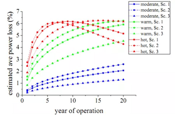 結(jié)果如圖所示,在炎熱地帶,年發(fā)電損失約達(dá)到5%,當(dāng)達(dá)到最大衰減以后,第7年以后組件在熱輔助的作用下開始功率恢復(fù),但是恢復(fù)的程度有限,需要花費(fèi)的時間也很長,如圖則需要10年以上。在溫暖地區(qū),第5年功率衰減達(dá)到4%左右。在中性氣候地區(qū),影響較小。