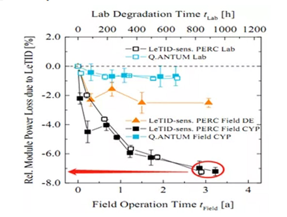 另外Friederike Kersten在論文《System performance loss due to LeTID》公開報(bào)道戶外測試結(jié)果,安裝場地位于賽普洛斯,氣候較為溫暖,使用多晶PERC電池組件,運(yùn)行三年以后的最大衰減為7%左右。